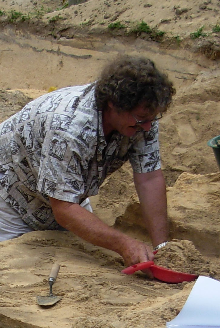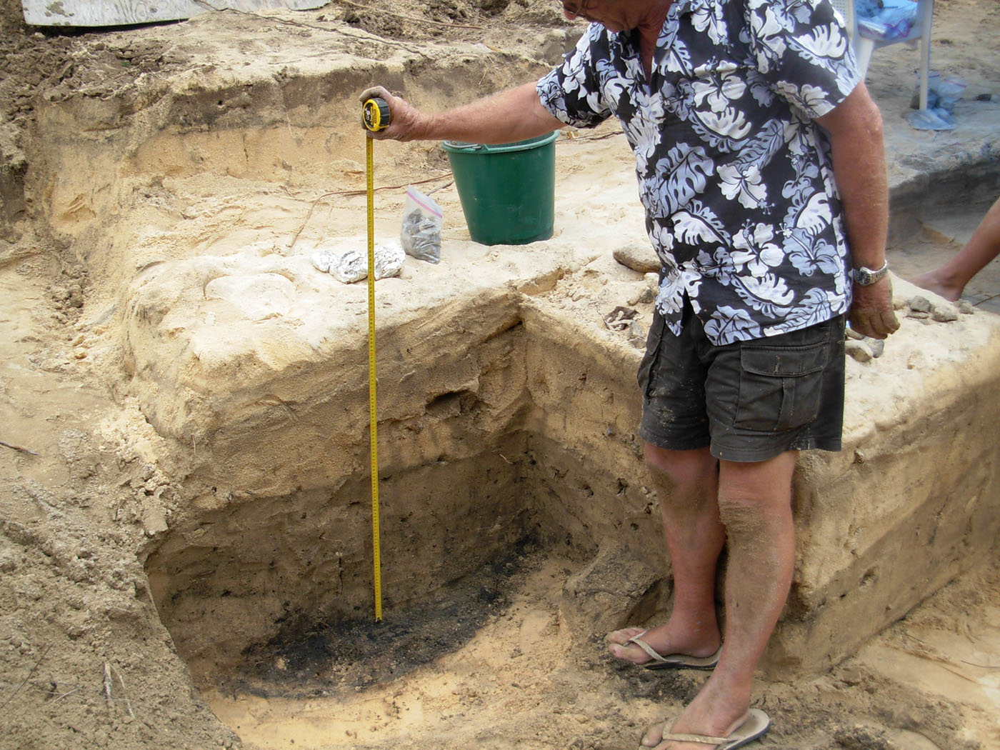 Normally one encounters the water table before getting to this depth, however the hardpan may be slightly higher here than elsewhere, (also the weather had been quite dry for the previous 2 months) In the photo below I am working in the D layer of Y3. This is the relatively clean sand layer that separates the upper cultural layer and the middle layer E, probably a storm/cyclone deposit.