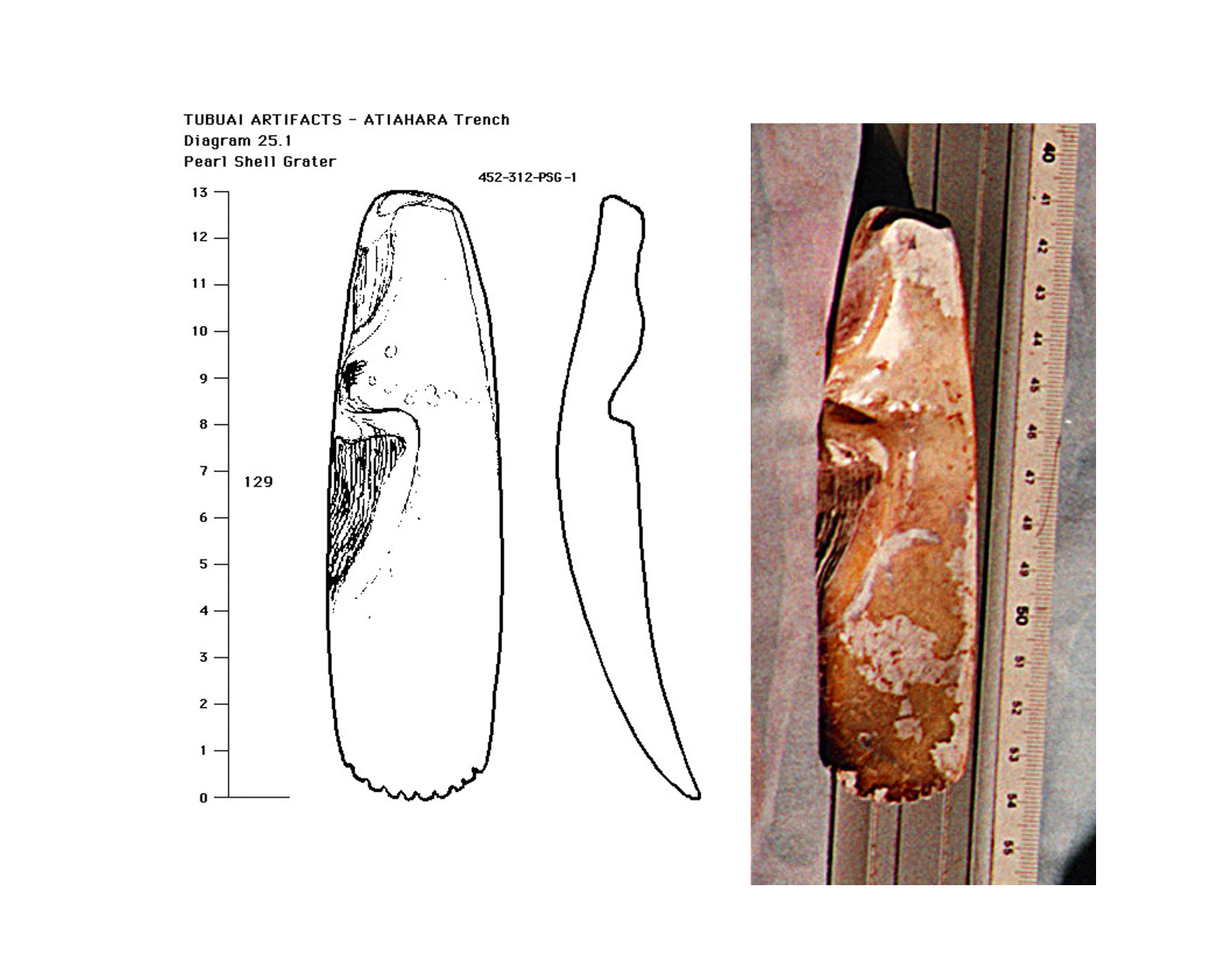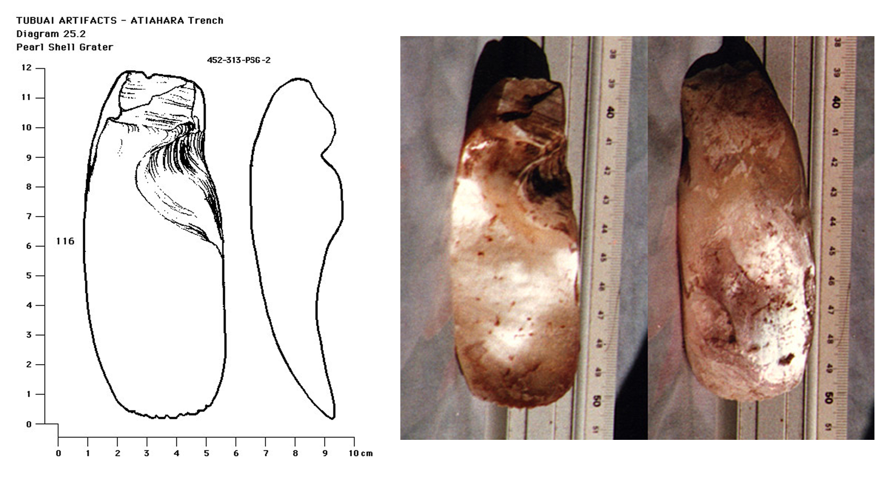 *****Y. H. Sinoto calls them graters when the edge is serrated, they are made of the thick hinge part of large pearl shells and in Tubuai I had previously found only one nearly complete example and a number of broken fragments to persuade me to think that this artifact was in fact in use at one time in Tubuai. (see Diagram 25.1) Also present in the Marquesas as well as Huahine this artifact is recognized as early by Sinoto. (See personal communication re the nearly complete AHOAPOFATU example illustrated Volume 18 (Diagram 18.26) *****The following day I thought it best to return and try to establish the exact location of the findspot of the grater by measuring from the road as well as looking for dateable charcoal etc. Never imagining that more artifacts could be found as they seemed few and far between and work now made more difficult with the walls collapsing due to my undermining, anyway I cleared away the fallen rubble and again proceed to scrape away at the discoloured bottom part of the lowest layer not far from where I found the grater. I did find some more poor quality charcoal as well as bones and a large piece of worked pearl shell but more surprising was the sudden appearance of another grater only about 50 cm further south and placed at about the same level and in the same way in the discoloured bottom part (see Diagram 25.2) I had hardly extracted this second grater when I came across a complete well finished adze which was placed vertically next to the grater. the lowest part of the adze very near to, if not partially imbedded in the sterile clean layer below. Another 20 or so cm further on I came across a large terebra shell chisel as well as a sea urchin spine. For these tools to be found more or less together and all in good condition, one might wonder if they do not represent some sort of a cache? |
